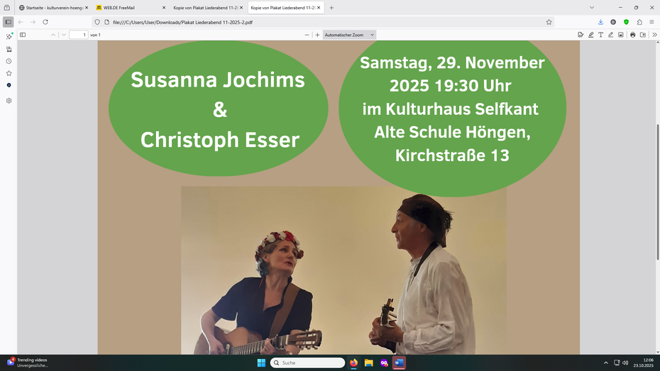 Am Freitag, 29.10. um 19:30 Uhr wird das Kulturhaus Selfkant, in Höngen, Kirchstraße 13 unter dem Zeichen eines Liederabends mit drei Duos stehen. Gemeinsam ist allen, dass sie einen recht engen Bezug hiesigen Raum haben, sich schon seit vielen Jahren mit Liedern vielfältiger Herkunft und Stilrichtung beschäftigen und überzeugt davon sind, dass sich diese unterschiedlichen Vorlieben und Interpretationsansätze sehr gut zu einem gemeinsam gestalteten Abend mit deutschsprachigen Liedern zusammenfügen.